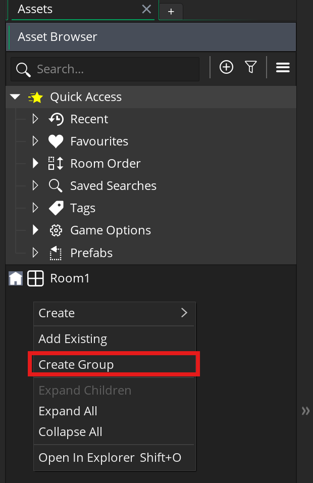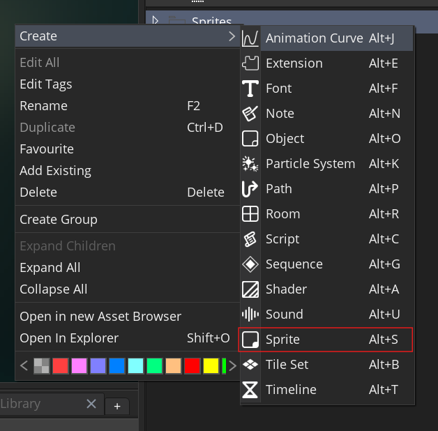 to make a sprite, right click on the blank space in the Asset Browser and click create group and call it Sprite. then, right click on that folder and click Create -> Sprite and call it sPlayer.