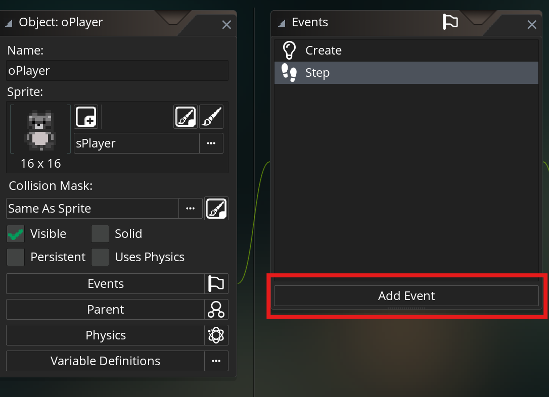 first open the oPlayer object (double click on it in the asset browser), click Add Event, and create a Create event and a Step event (just the normal Step event)