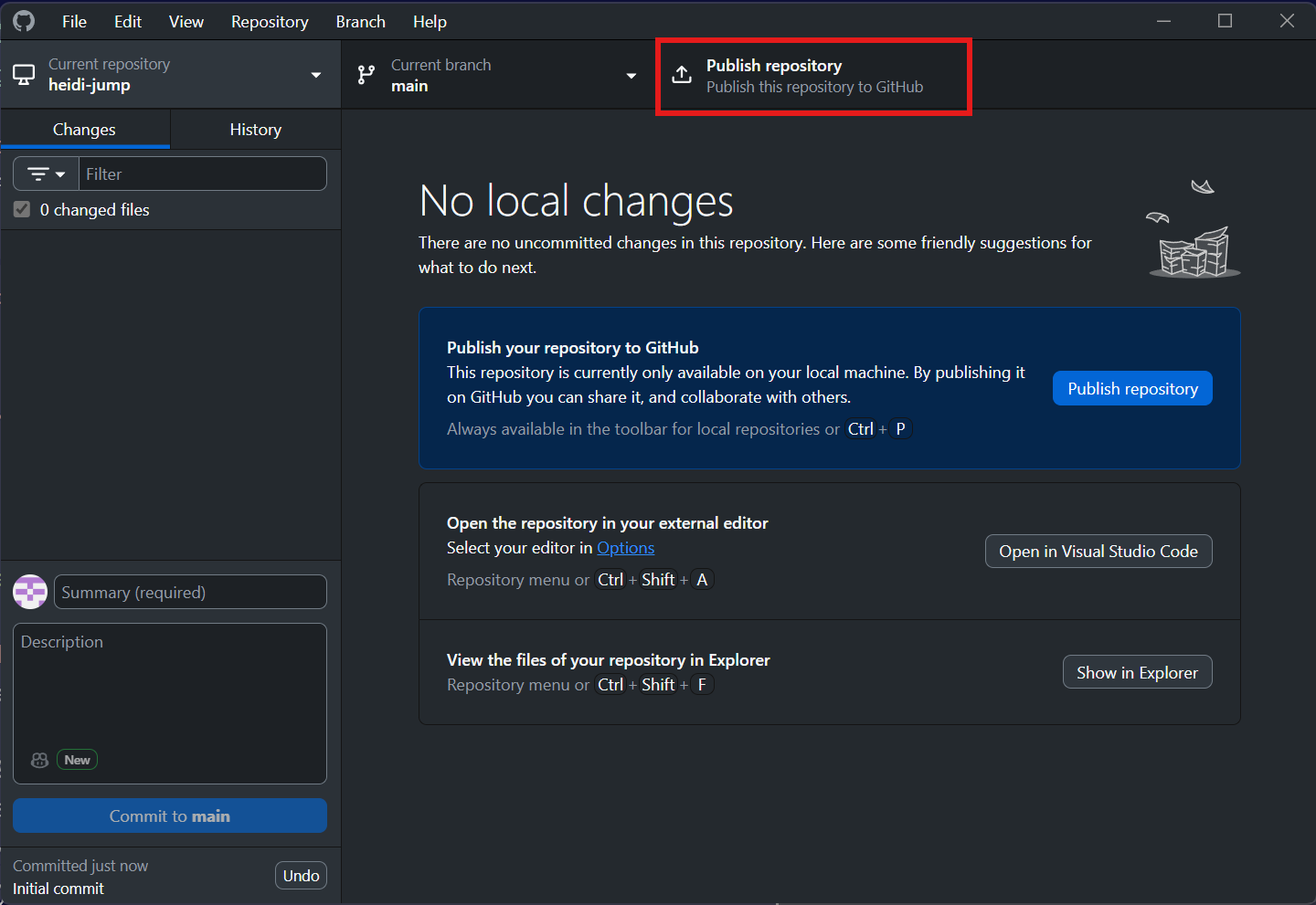as you make changes to you project, (make sure you save your project regularly) you will see changes in github desktop, then you can commit them to main (essentially save your changes) and push it origin (upload your changes to github)