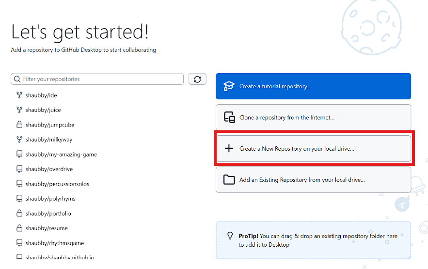next, click Create a New Repository on your local drive and set the Local path the the location of your Gamemaker Projects folder.