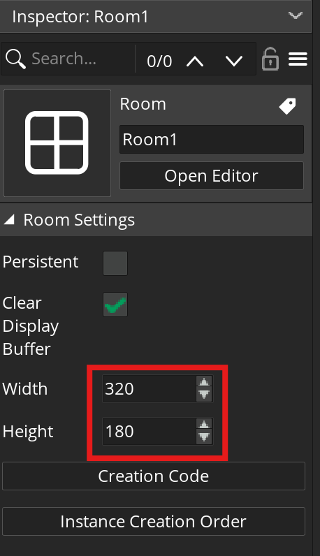 the default room size is pretty big, so lets change it 320 x 180 in the Inspector on the left.